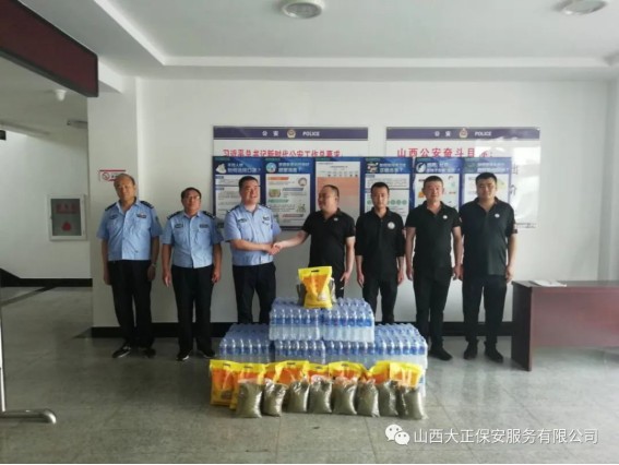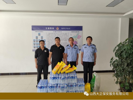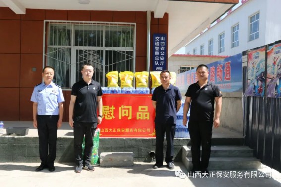 6月1日,山西大正保安服務(wù)(集團(tuán))有限公司守押四分公司軒崗中隊(duì)中隊(duì)長江達(dá),代表公司到原平市公安局交通警察大隊(duì)軒崗交警六中隊(duì),慰問一線執(zhí)勤交警,為烈日下辛苦執(zhí)勤的一線民警送去降溫解暑的飲用水和食物,他們頂烈日,冒酷暑,吃苦耐勞,全心全意為人民服務(wù)。呼吁全體人員向交警學(xué)習(xí),牢固樹立交通安全意識,支持交警工作,做遵守交通法規(guī)的遵守者和守護(hù)者。